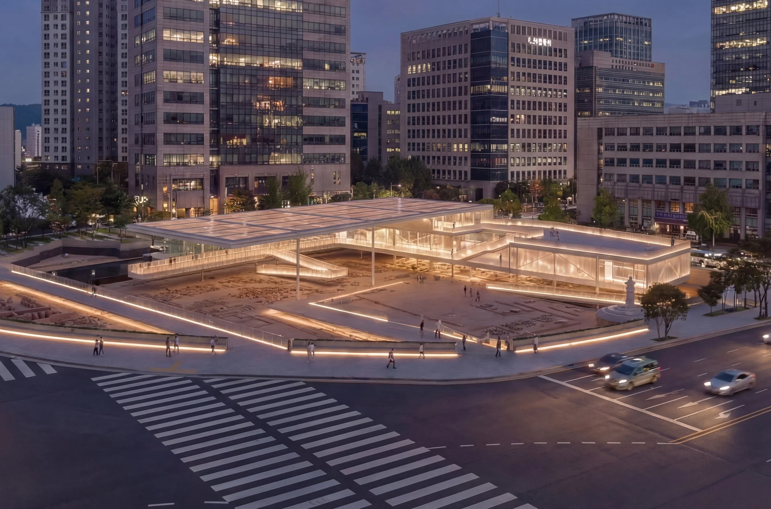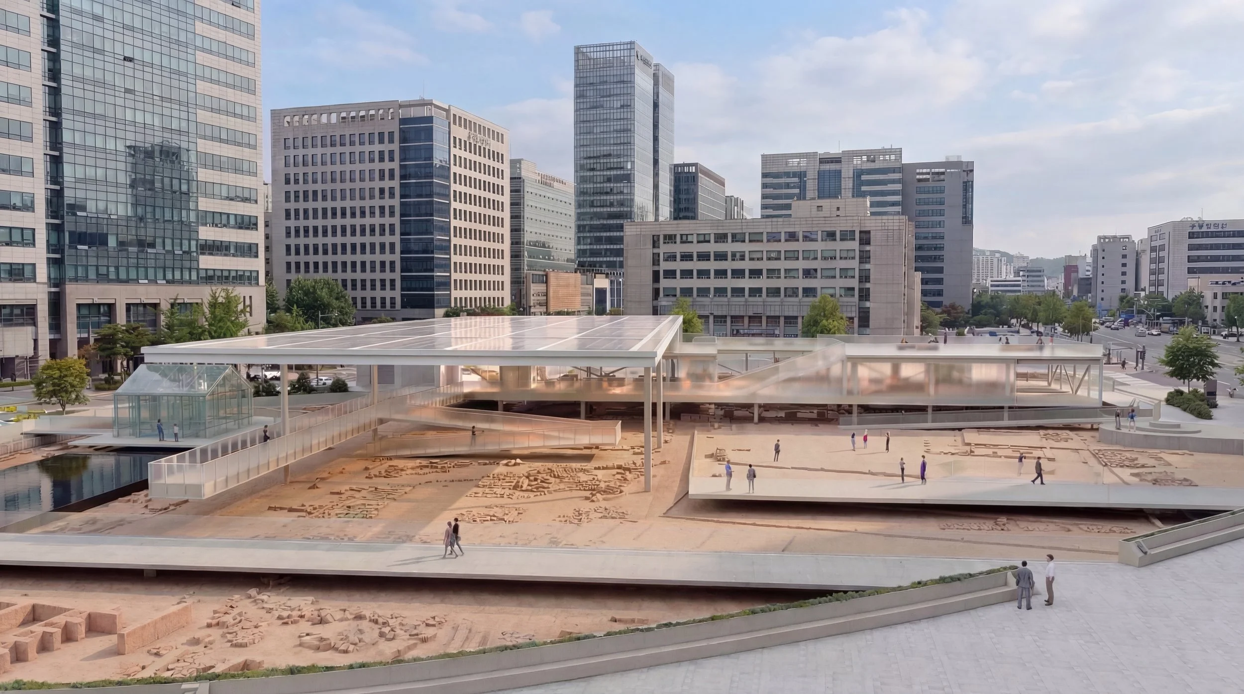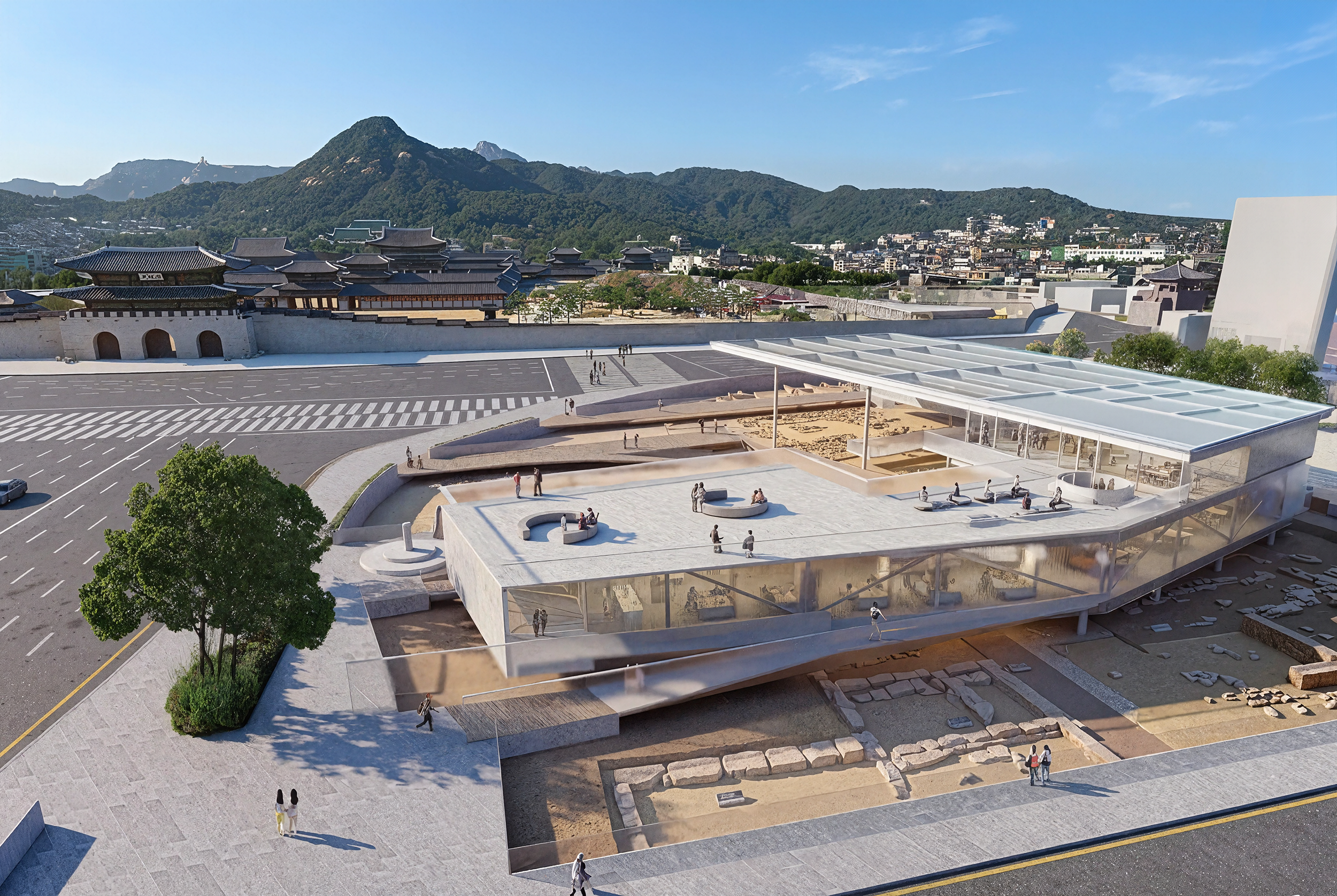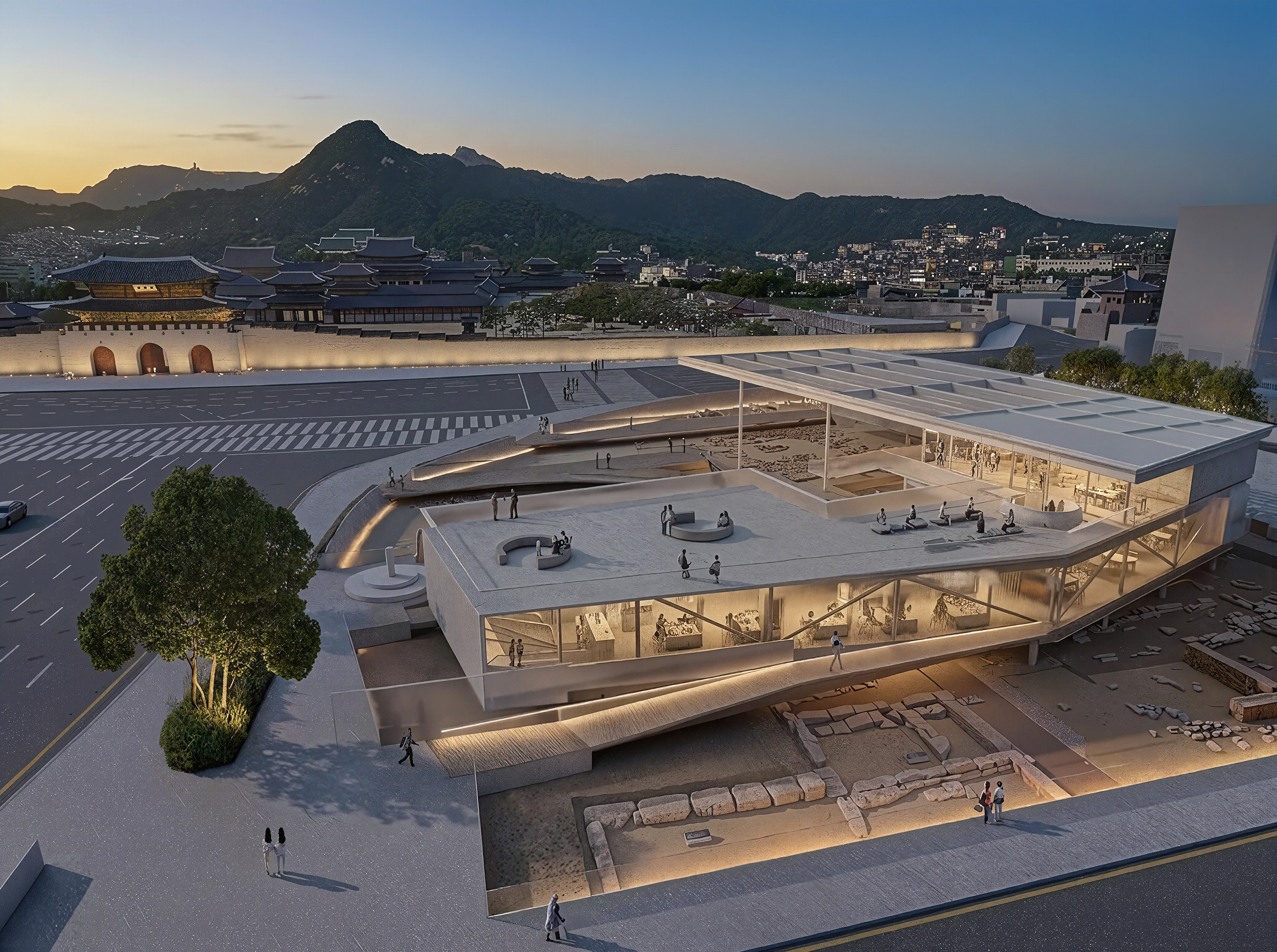 OVERLAPPING HISTORIES is an armature that reveals and juxtaposes the overlapping layers of history at the former site of the Uijeongbu (Joseon Era city offices) in Seoul. The route through the site and building encourages a visual dialogue between past and present, engaging visitors in the site and its surroundings. The plan choreographs their movement and focuses them on specific sections of the structural remnants. These moments are juxtaposed with periodic openings to the modern surroundings and Gyeongbokgung Palace. The entire building is suspended above the site on a lightweight, modular, and demountable steel structure, allowing complete access to the ruins and the potential for further study, exploration, and restoration during building operation. A lightweight canopy shelters the Jeongbondang and Hyeopseondang and frames views of Gyeongbokgung Palace from its balcony and the gallery beyond. The steel structural frame of the building is clad in a lightweight translucent polycarbonate skin and glazing, furthering the dialogue between building methods past and present. At night, the translucent envelope and canopy will be lit with a soft glow as a luminous counterpoint to the Gyeongbokgung Palace while illuminating the archaeological remnants below. A long balcony overlooks the former gazebo which has been reconstructed in glass bricks - giving a clear but also ambiguous impression of what existed in the past. The gazebo overlooks a modern reconstructed pond offset within the outline of the remnants of the former pond. The entire site is considered a “park” open 24 hours a day - both an archaeological park and a public park for the surrounding community.
