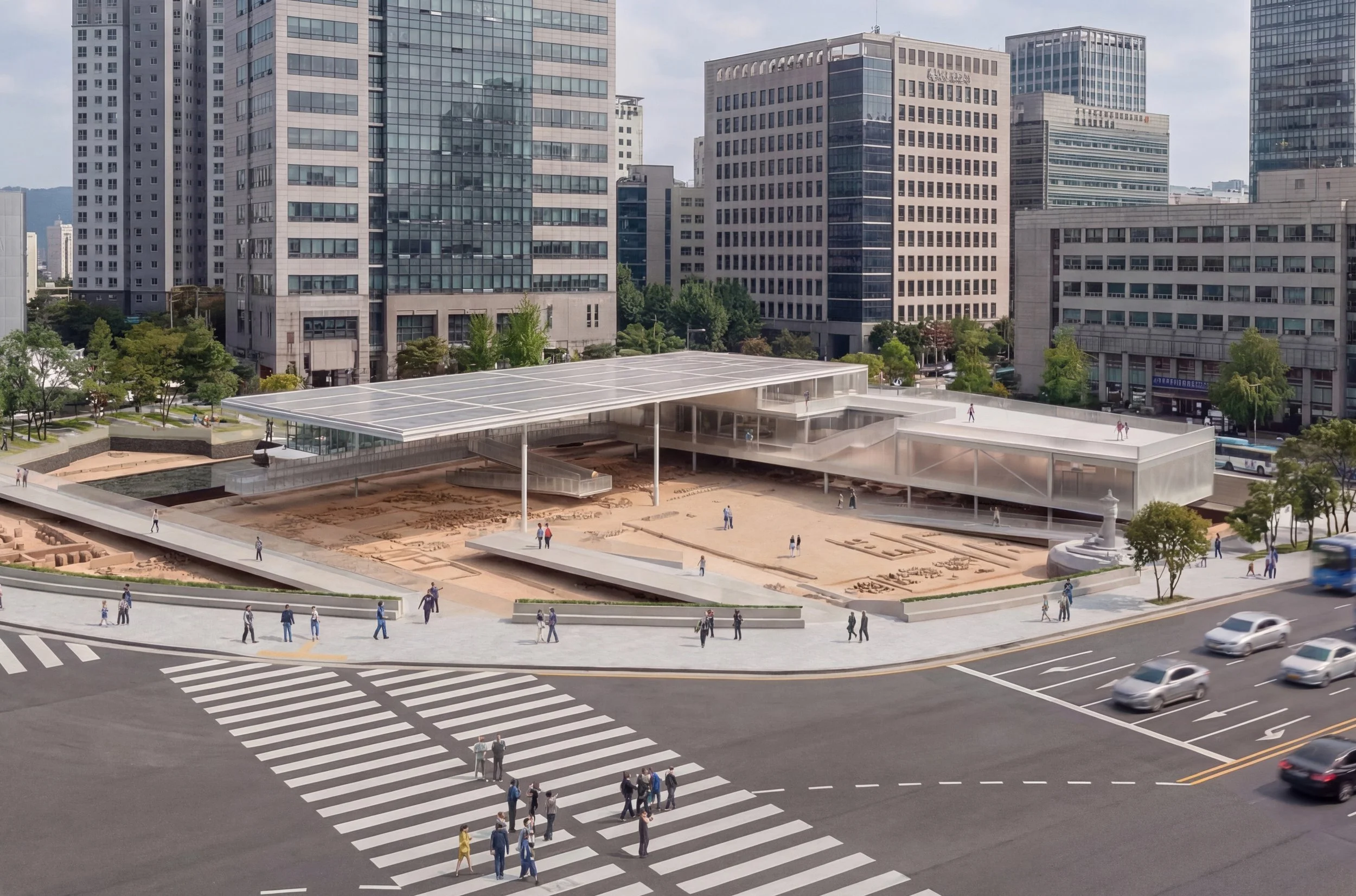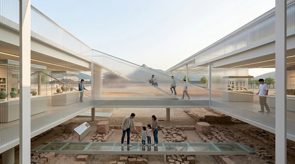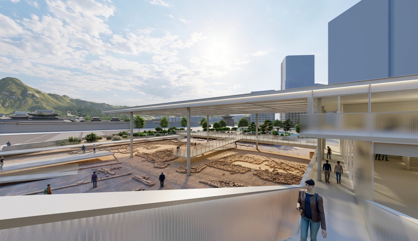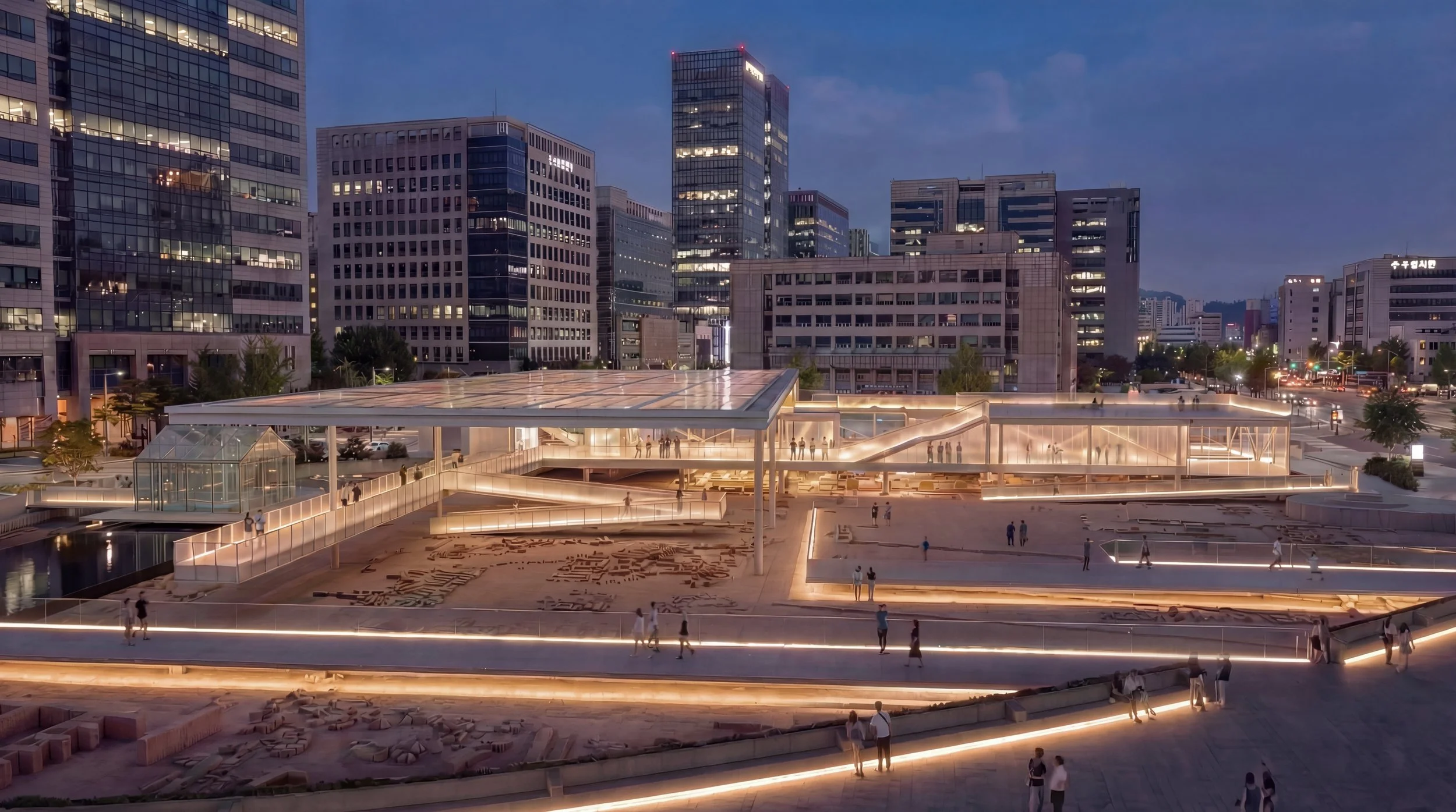 OVERLAPPING HISTORIES is an armature that reveals and juxtaposes the overlapping layers of history at the former site of the Uijeongbu (Joseon Era city offices) in Seoul. The route through the site and building encourages a visual dialogue between past and present, engaging visitors in the site and its surroundings. The plan choreographs their movement and focuses them on specific sections of the structural remnants. These moments are juxtaposed with periodic openings to the modern surroundings and Gyeongbokgung Palace. The entire building is suspended above the site on a lightweight, modular, and demountable steel structure, allowing complete access to the ruins and the potential for further study, exploration, and restoration during building operation. A lightweight canopy shelters the Jeongbondang and Hyeopseondang and frames views of Gyeongbokgung Palace from its balcony and the gallery beyond. The steel structural frame of the building is clad in a lightweight translucent polycarbonate skin and glazing, furthering the dialogue between building methods past and present. At night, the translucent envelope and canopy will be lit with a soft glow as a luminous counterpoint to the Gyeongbokgung Palace while illuminating the archaeological remnants below. A long balcony overlooks the former gazebo which has been reconstructed in glass bricks - giving a clear but also ambiguous impression of what existed in the past. The gazebo overlooks a modern reconstructed pond offset within the outline of the remnants of the former pond. The entire site is considered a “park” open 24 hours a day - both an archaeological park and a public park for the surrounding community.