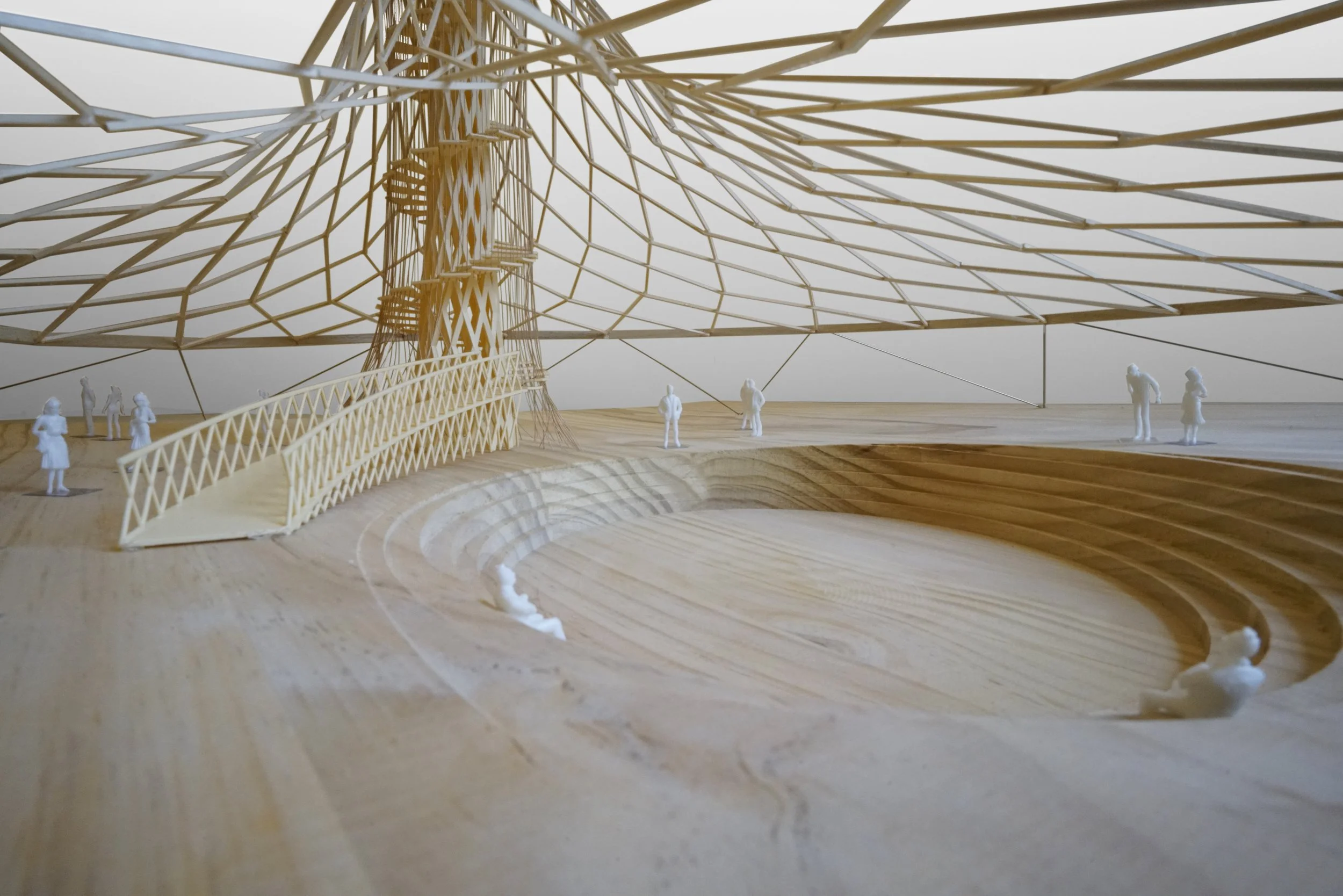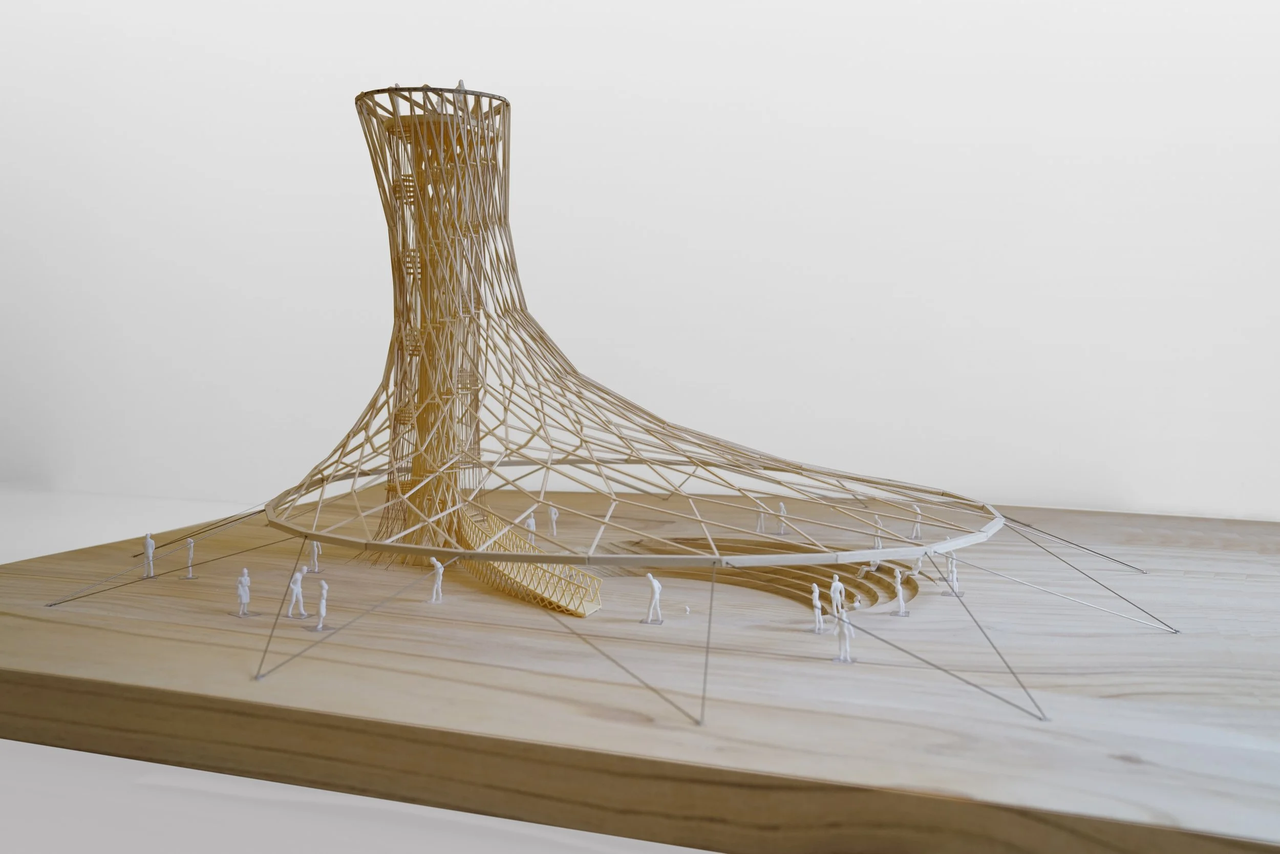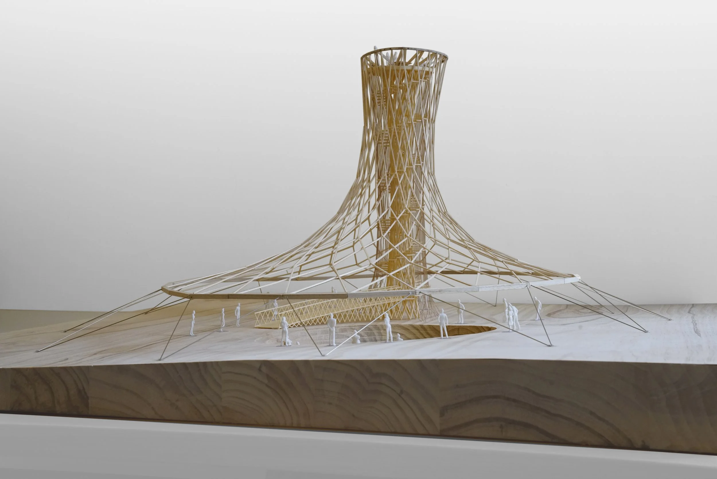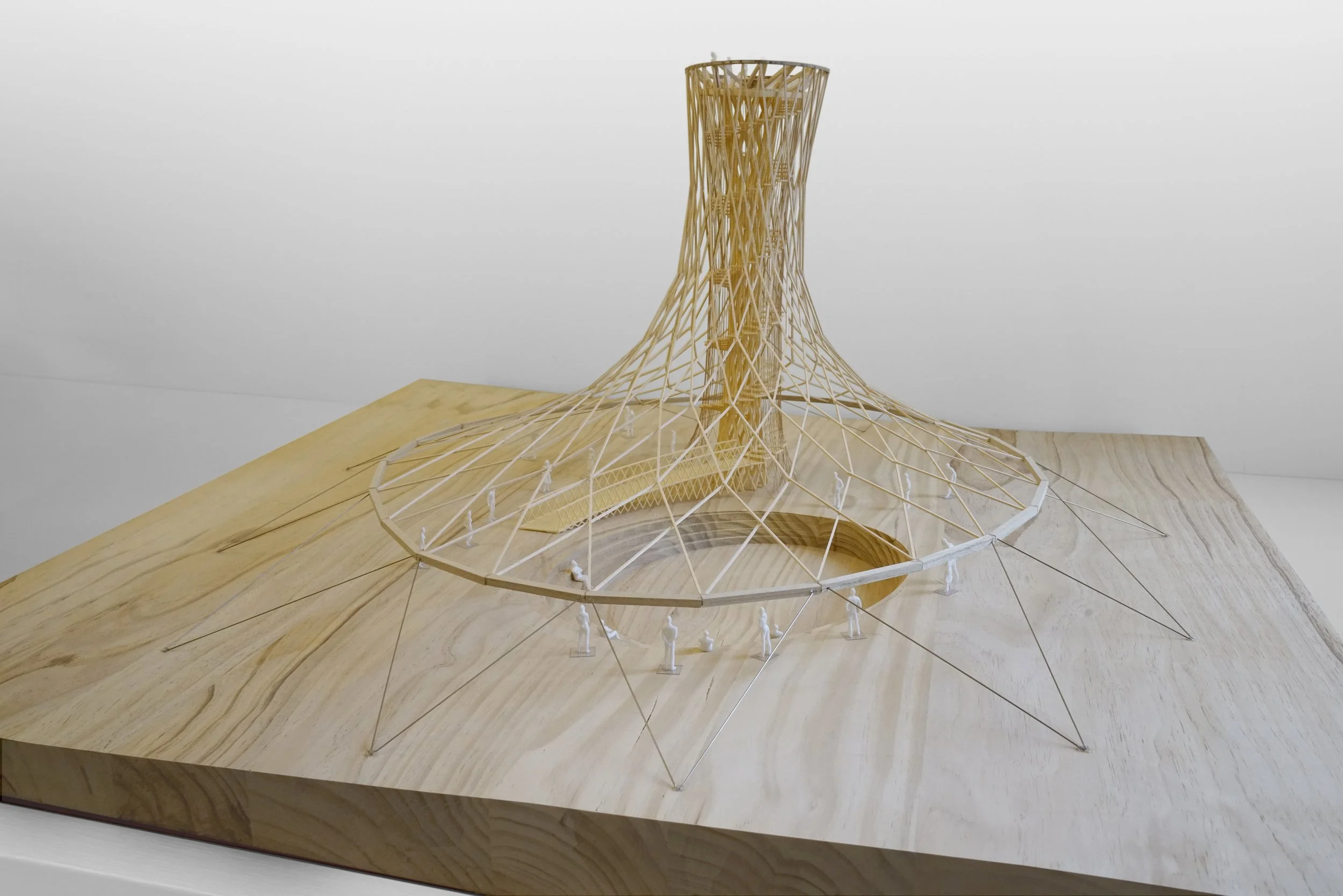 The canopy is structured by a lightweight wood frame hung from the wood framed tower core and anchored to the ground in tension with lightweight steel cables. 75mm square timber members are layered to build up the faceted canopy, 150mm square timber members build up the core, and 300mm square members form the ring beam at the base of the shell. Threaded through-bolts connect the curved timber members at intersection points for simple assembly. 20mm diameter cables are used to stabilize the shell canopy at the outer perimeter, anchoring the outer ring to a rock ballast foundation.