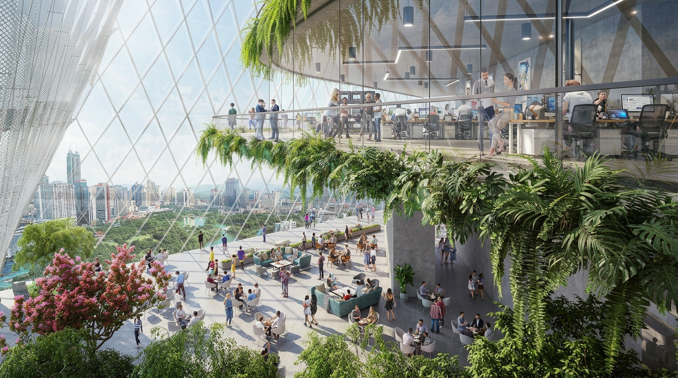 The uppermost sky garden is an open air public venue for casual interactions and meetings.