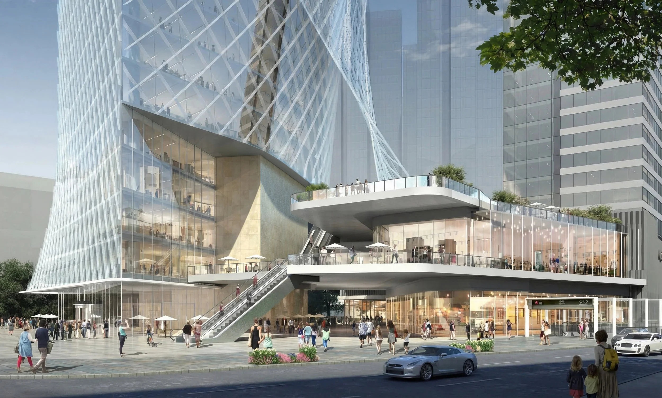 The facade of SHEAR TOWER is comprised of two layers, a diagrid curtain wall and an exterior cable mesh with expanded metal fins that is stretched across the entire surface of the building, inflecting and deforming at the major public spaces. The stretched mesh allows the public spaces to be open air while acting as an external shading device in the subtropical climate.
