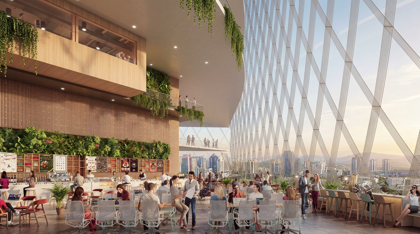 The central public space is designed as a co-working environment with open air double height spaces.