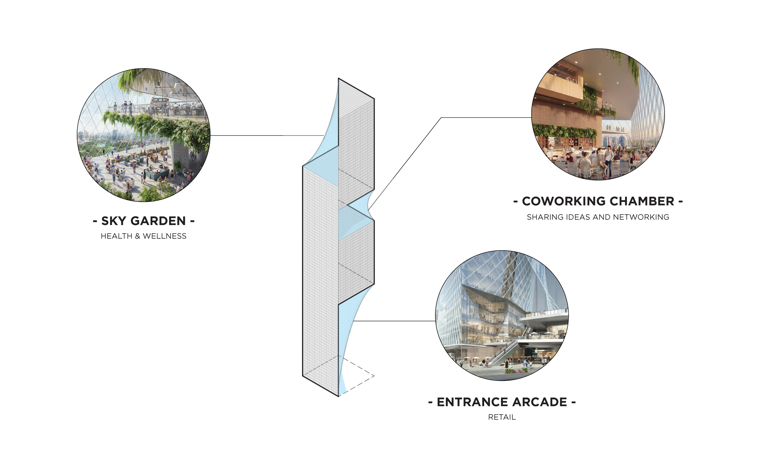 SHEAR TOWER is a simple square extrusion that has been “sheared” to form three distinct public spaces protected by a stretched mesh wrapper that acts as an external solar shading device. The office spaces are designed for emerging offices and start ups that frequently utilize co working strategies and freelance office workers.